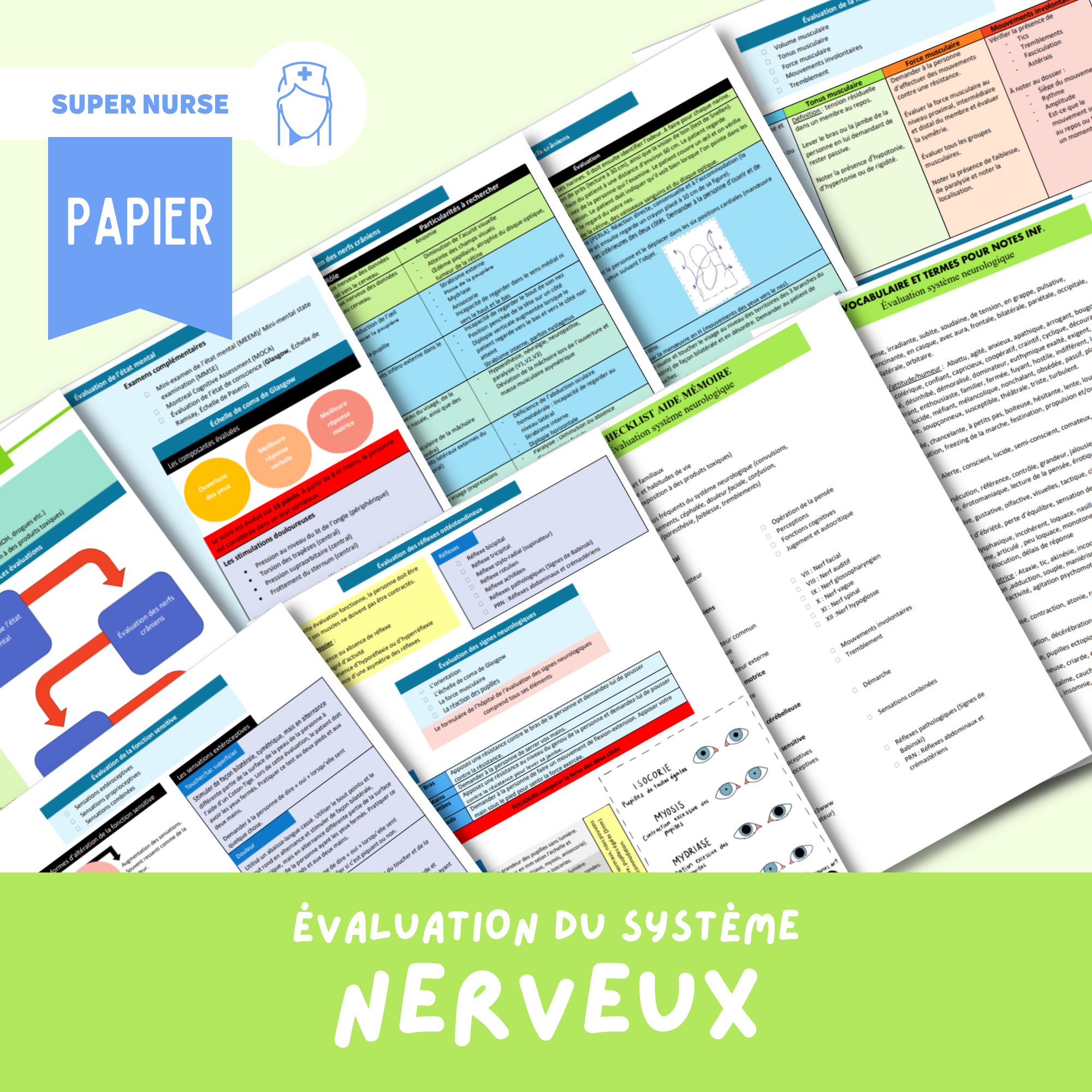 This includes major symptoms, questionnaire, mental status assessment, cranial nerve assessment, motor, sensory and cerebellar function assessment, reflex assessment, basic neurological assessment as well a checklist helps memory. in normal format (8.5 x 11) and in small format (plastic sheet approximately 4 x 6 in).