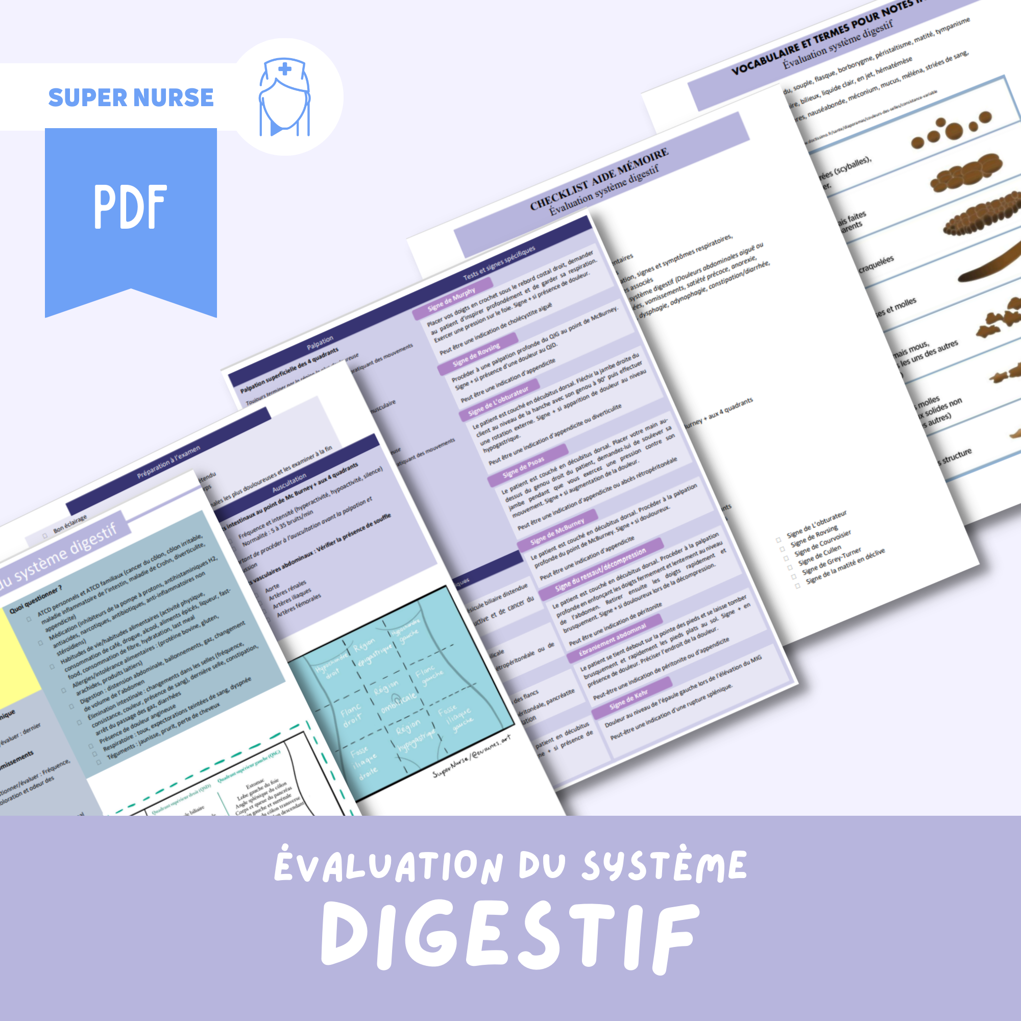 A description of the clinical examination of digestive function. This includes the main symptoms, questionnaire, inspection, auscultation, percussion, palpation, specific tests and signs, as well as a memory aid checklist.